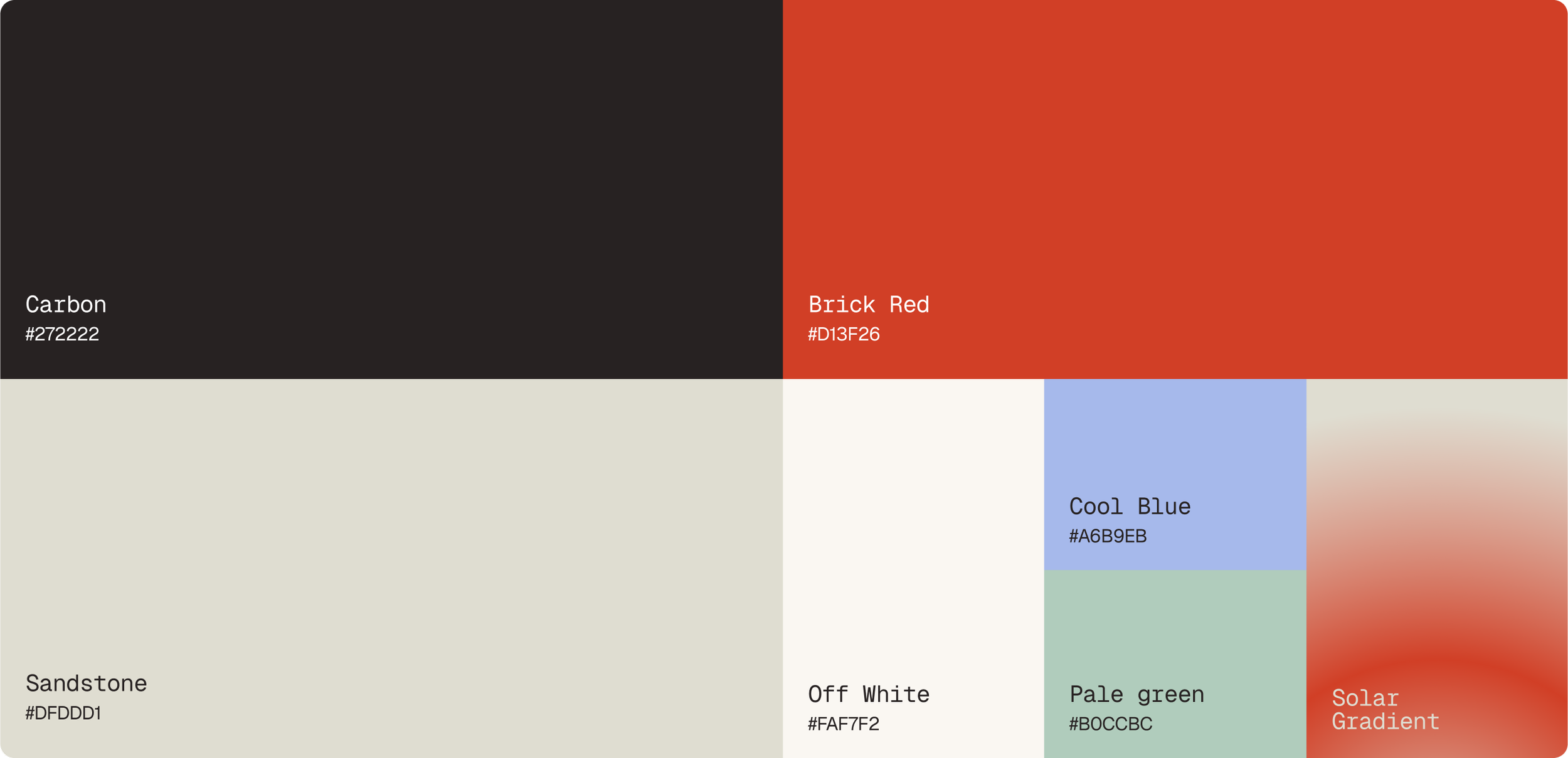 A core palette of brick red, sandstone, and black creates a timeless yet modern foundation—grounded, confident, and distinct from conventional energy branding.